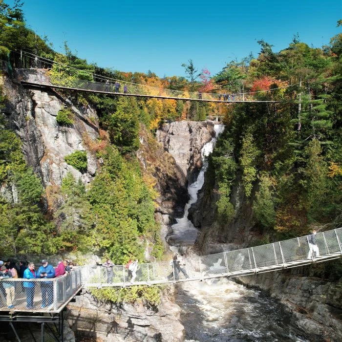 An impressive canyon carved into the 1.2-billion-year-old bedrock by the powerful Sainte-Anne Falls. Admire the spectacular 74-m waterfall (at 243’, higher than Niagara Falls). Walk across 3 suspension bridges, including one hanging at 60 m (197’). Challenge yourself with AirCANYON, a thrilling zipline 90 m (295’) in the air, which will have you flying above the gorge at 50 km/h (30 mi/h). An exciting family activity! Easy pathways and wheelchair accessible. Pet friendly.