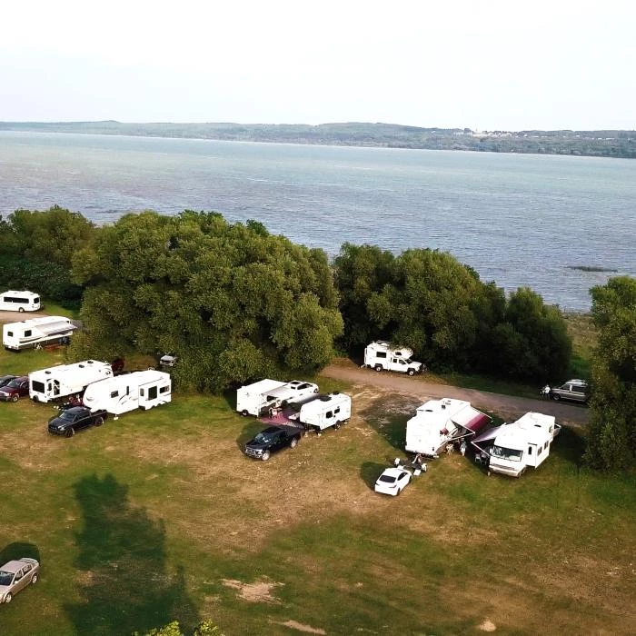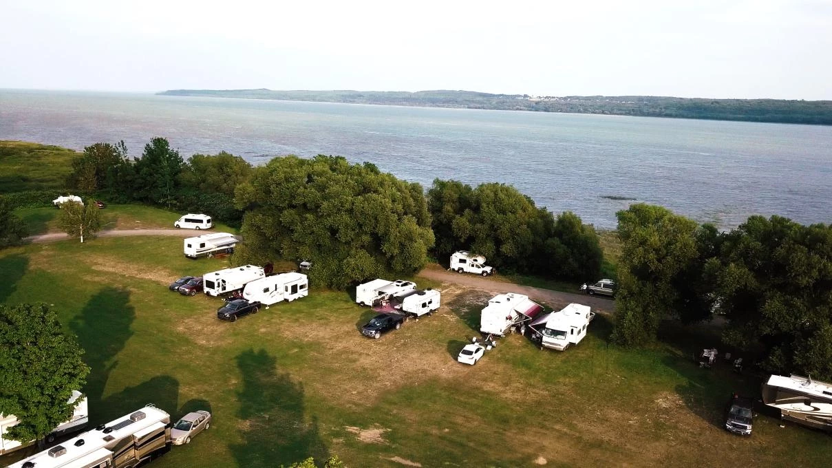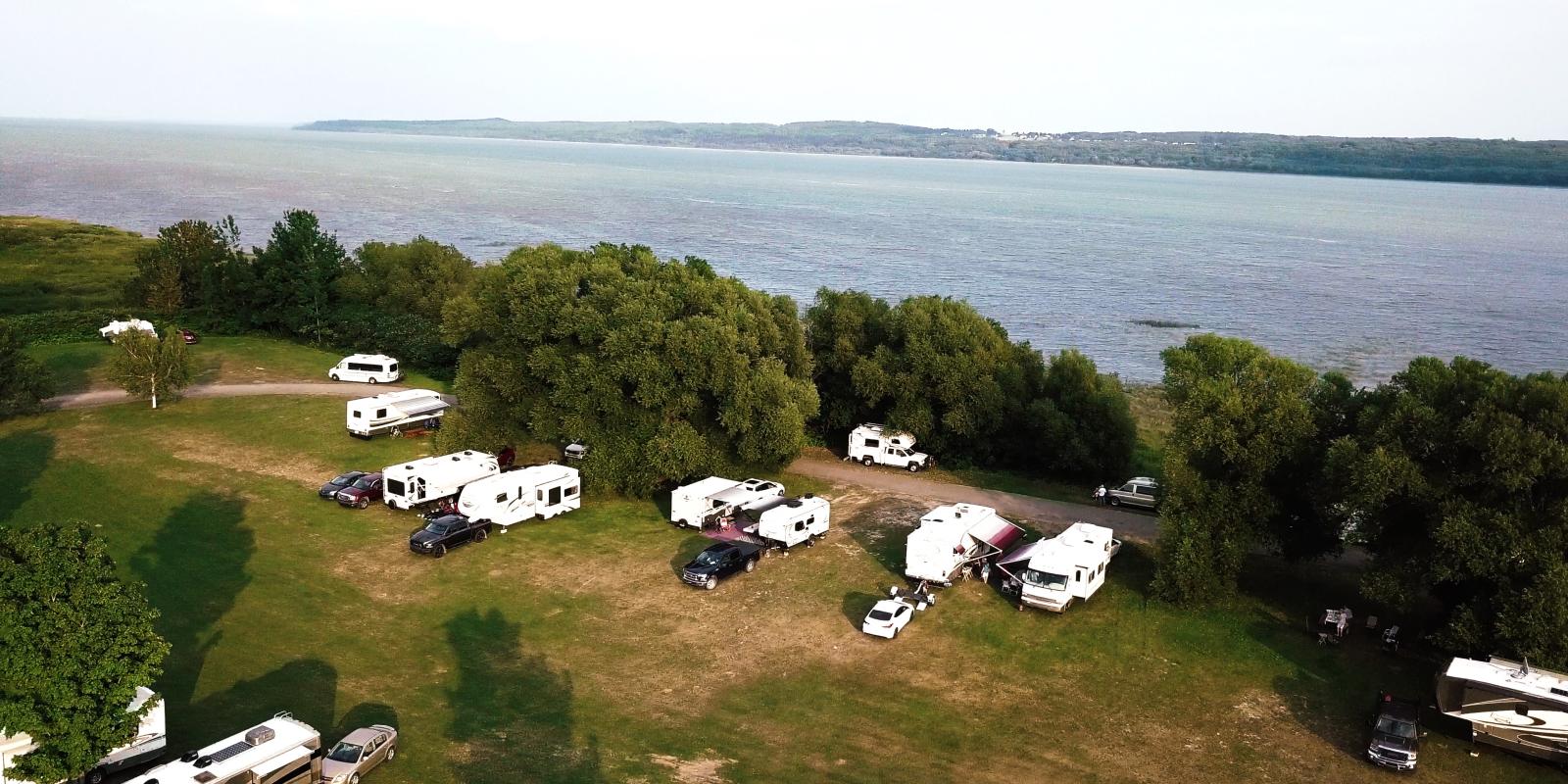 Located on a grassy plateau lined with a few mature trees, this site stretches along the shoreline of the St. Lawrence River and lies across from the Sainte-Anne Basilica. Being in the heart of the region, there are many services and attractions nearby. Be sure to consult our calendar of events! Onsite services: charcoal BBQs, campfire pits, old-fashioned skate rental and a dumping station.