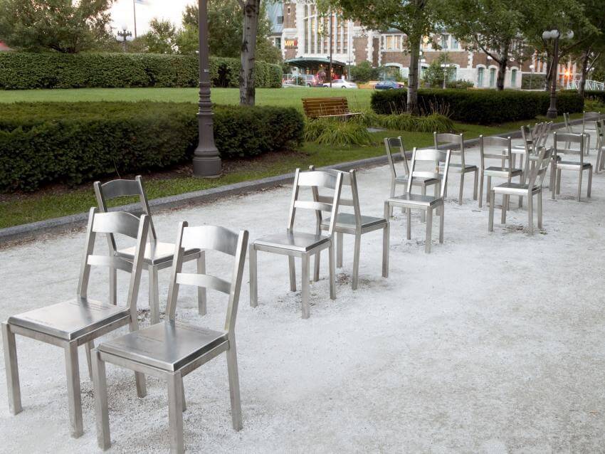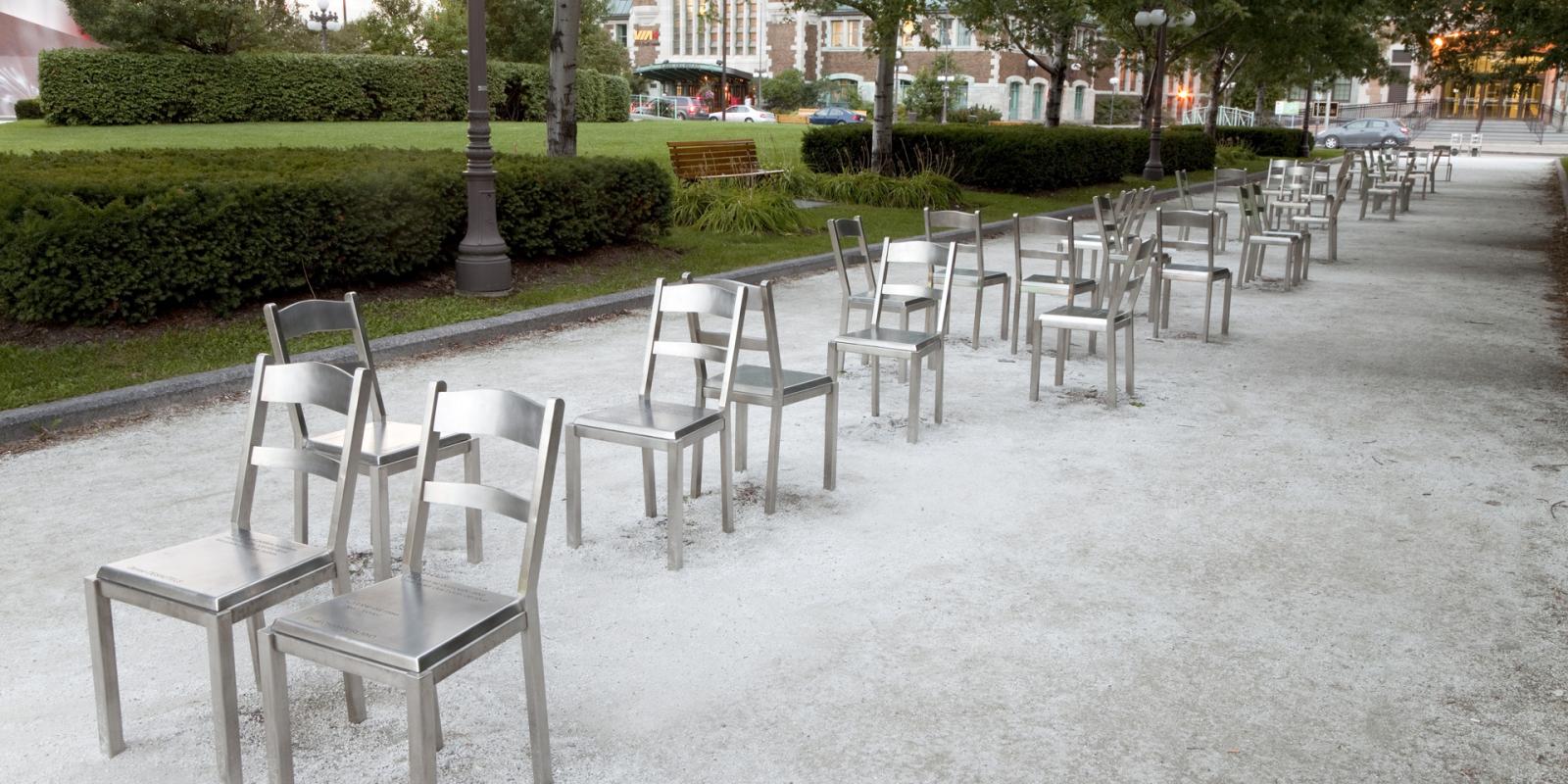 Location: Place de la GareForty chairs are set out in pairs on the sidewalk, each inscribed with passages from poems by 40 Québec authors from various time periods. They “express, in the span of a free moment, where we have been, who we are, and the joy of getting together.” The walkway thus constitutes a portrait of society from the city’s origins to the present day.