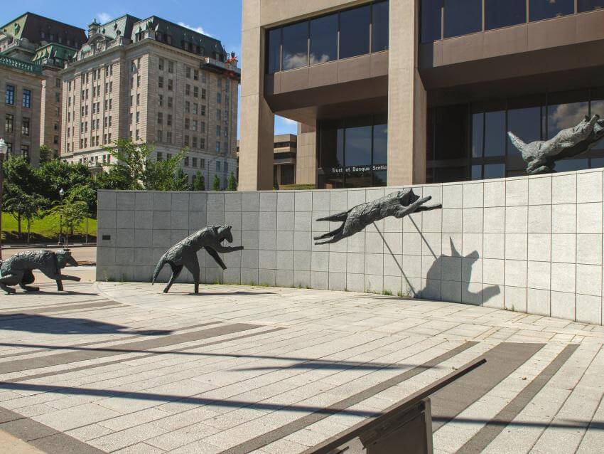 Location: 100 boulevard René-Lévesque EstThis group of bronzes, integrated into the surrounding architecture and urban environment, deconstructs the movement of an animal in full flight.