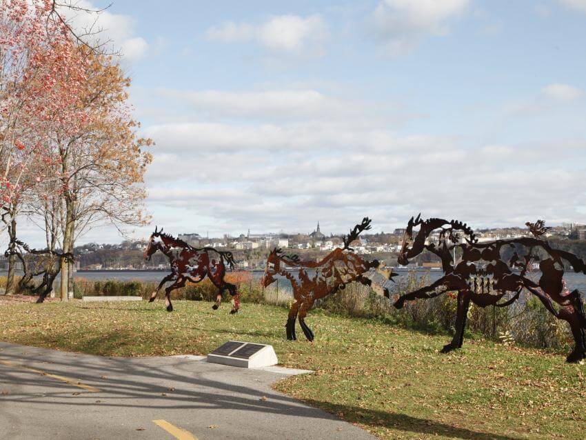 Location: Notre-Dame-de-la-Garde Park8 steel horses seem to be galloping along the river and Boulevard Champlain, their outlines energized with openwork motifs depicting scenes and figures from the nation’s past. A commemorative plaque explains the importance of horses in the development of New France and the Canadian West.