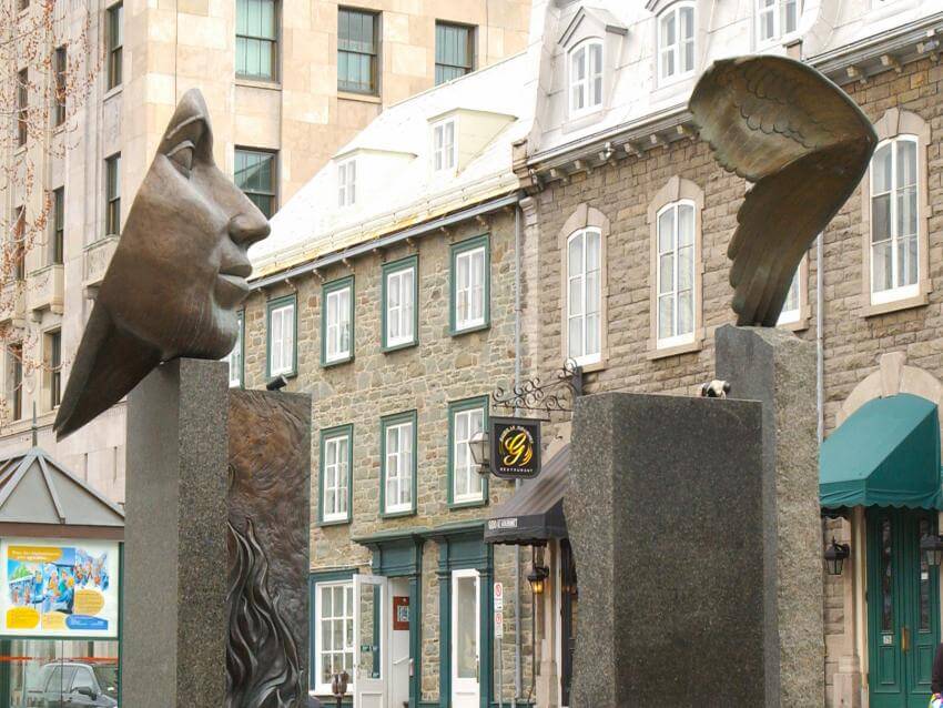 Location: Avenue Honoré-MercierThe six masts rising from the median strip represent Jacques Cartier’s ships drawing up at the Saint-Charles River in 1535. Atop the masts, golden metal sculptures float like sails in the wind. The omnipresent bell-tower motif recalls the role of the Church in Québec City’s development and in sustaining the French fact in North America.