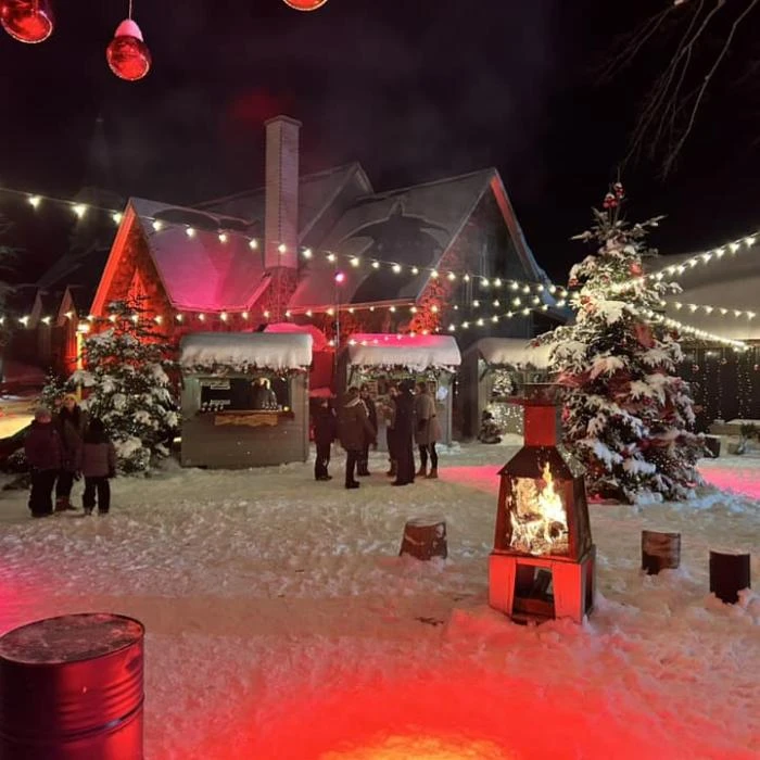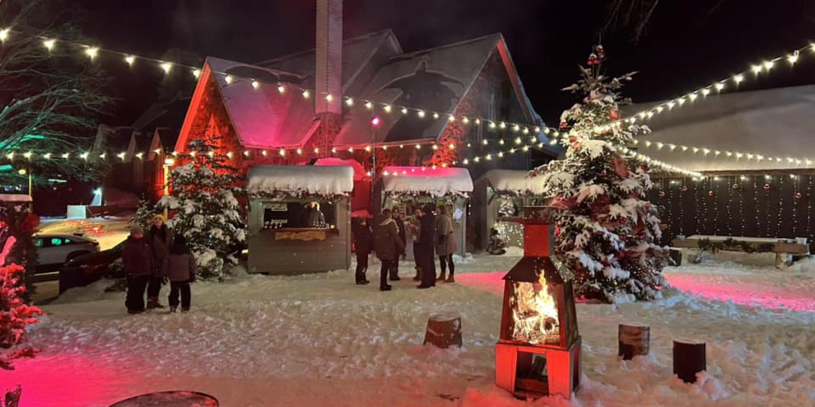 Illuminated outdoor booths, festive decorations, and shimmering lights blend with the breathtaking view of the mountains and the village, creating a setting that is both warm and enchanting.
