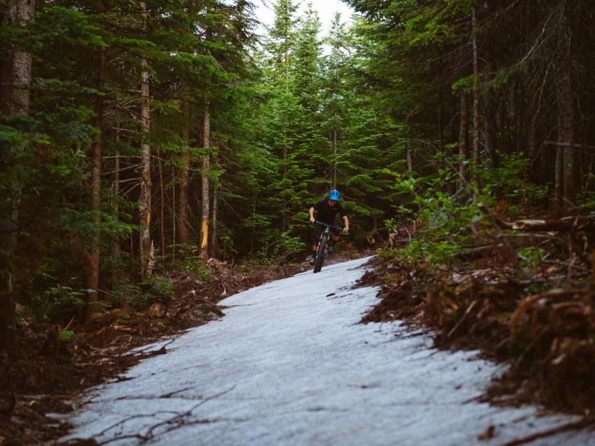 The granite found on the Maelstrom Mountain is porous, which makes the rock really grippy, even in the rain. It is definitely a unique feeling! The trail starts with an obstacle which will give you a great idea of the technical level to expect during the whole descent. This will basically allow you decide if you should keep on going further down or not, since speed & breaking control are unnegotiable on that trail. The unique views of the Québec City area make this ride even more amazing! It is definitely worth it to take a few breaks and admire the gorgeous landscape.