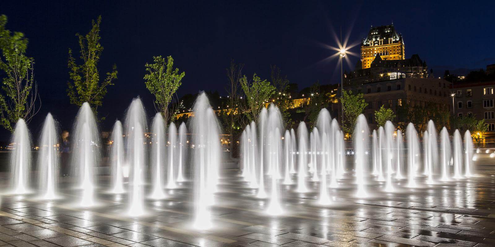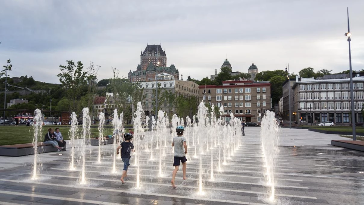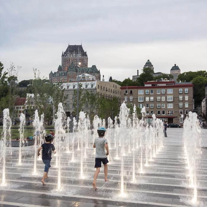 The design of place des Canotiers is inspired by 19th-century wooden wharves. Stroll along the sidewalks crossing the square diagonally to see the works of art and climb to the top of the belvedere, from which you can look out over the river. Rest areas, ground-level water fountains, intermittent mist sprays and flagstones arranged to resemble waves create an oasis nestled between the St. Lawrence River and the historical portion of the city.