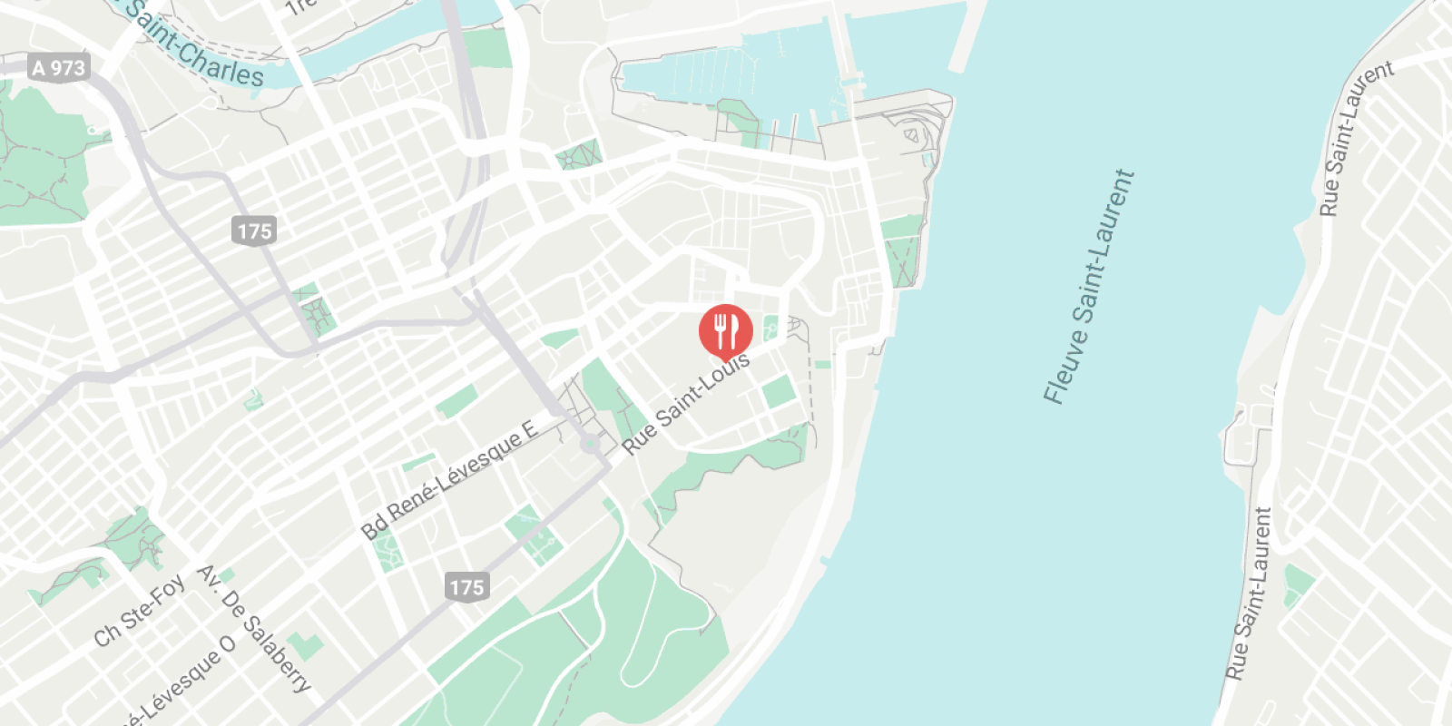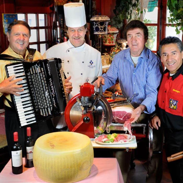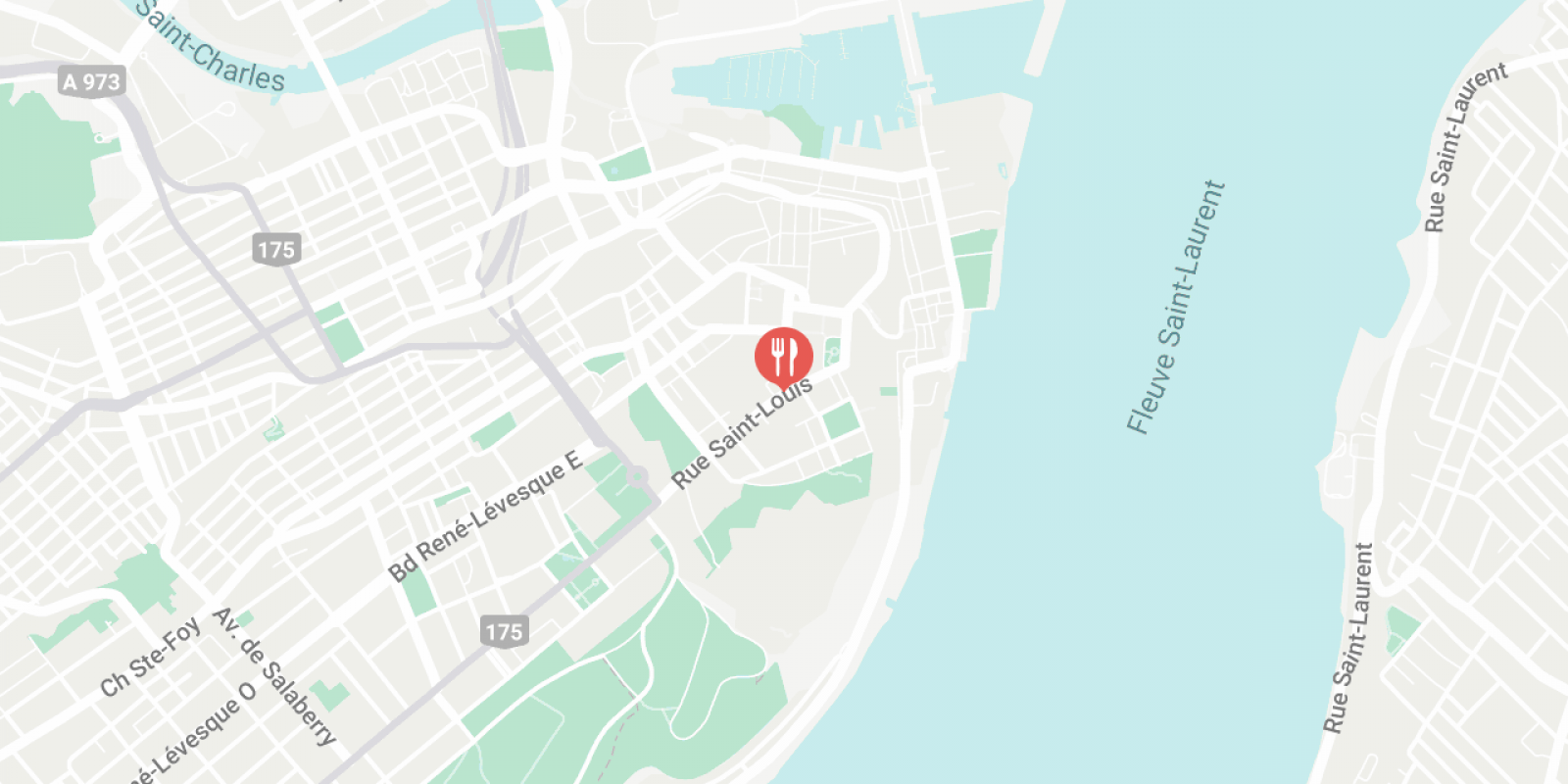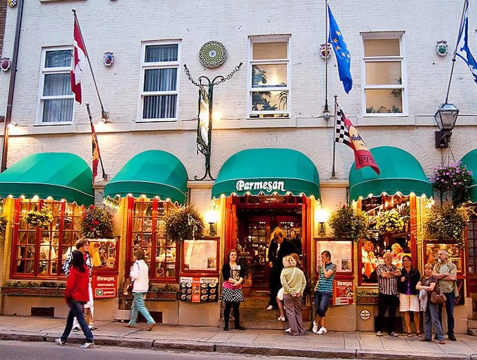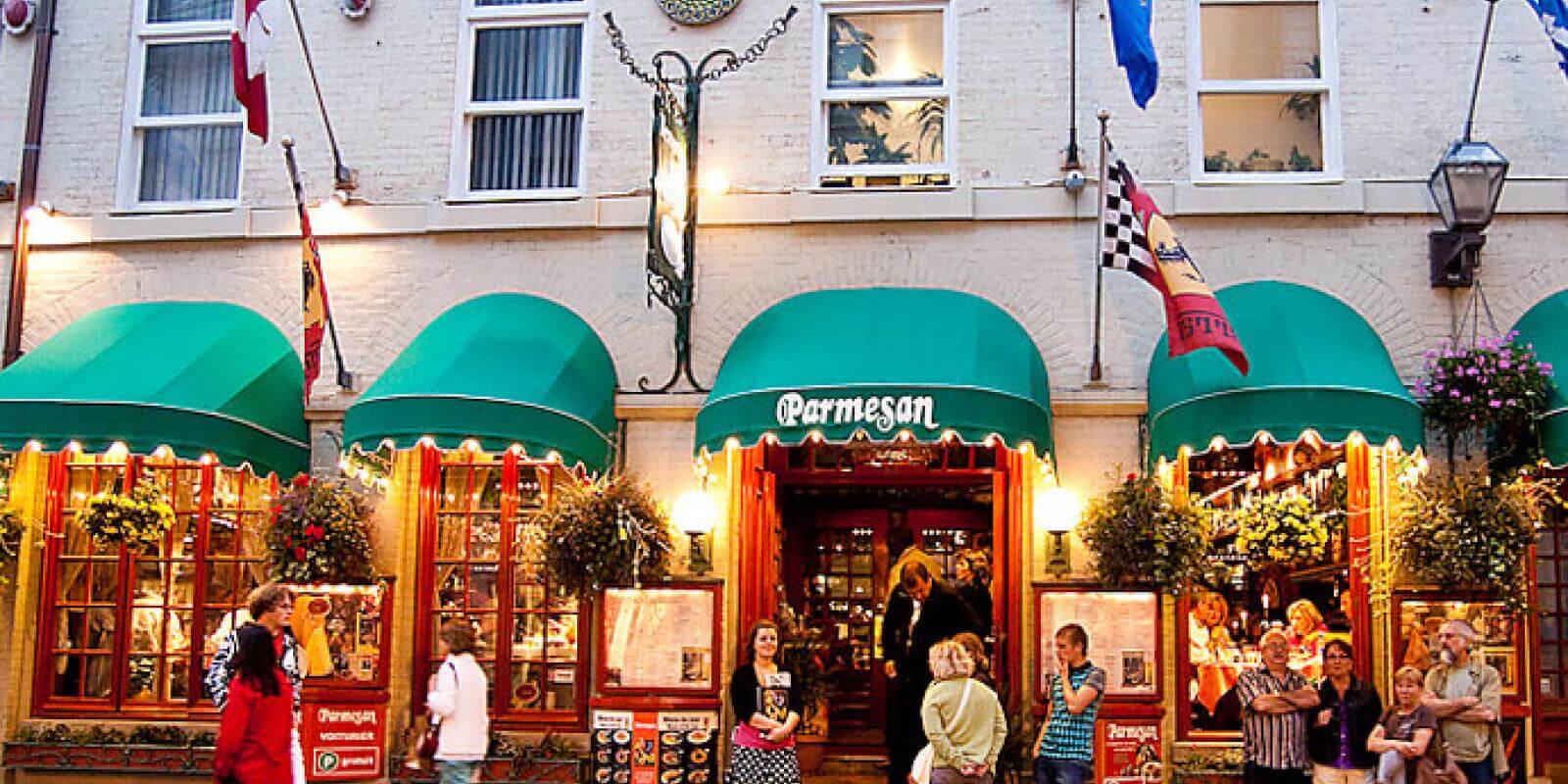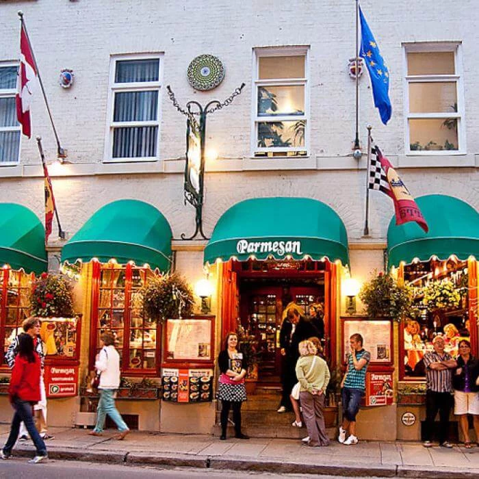 L'endroit où tout est spécial. Près du Château Frontenac. Cuisine italienne et française à son meilleur. Spécialités : saumon fumé, jambon de parme préparé spécialement par Luigi, pâtes maison, veau et fruits de mer, steak au poivre façon du chef. Grâce à sa cuisine et sa décoration uniques renommées par les médias du monde entier, entre autres : « Géo », « National Geographic » et « Believe it or not », et son ambiance chaleureuse avec l'accordéoniste ou le chansonnier, tous les soirs, Au Parmesan, c'est... La dolce vita! Service de voiturier.