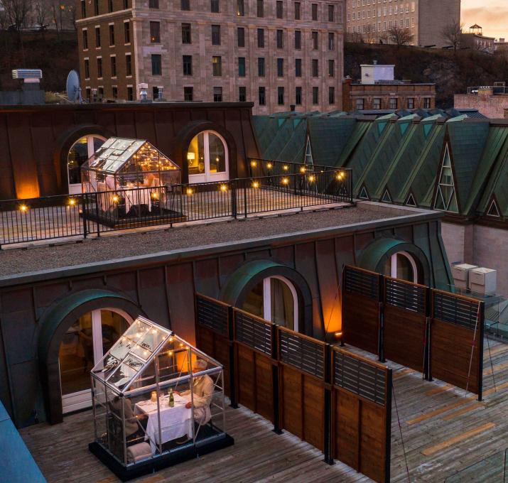 À l'Auberge Saint-Antoine, de mini-serres chauffées sont transformées en petits restos individuels et permettent de savourer un repas dans un décor historique en formule avec ou sans nuitée.