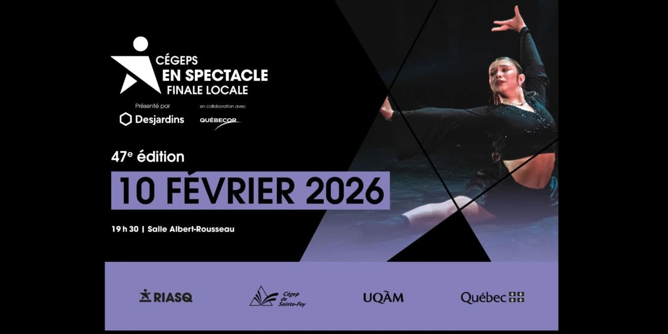 Pour la 47e édition de Cégeps en spectacle, le plus important concours francophone des arts de la scène du milieu collégial québécois, le Cégep de Sainte-Foy vous accueille pour leur finale locale. Regroupant 10 numéros, 44 artistes, 4 animateurs et plusieurs étudiants et étudiantes bénévoles à l’arrière-scène, c’est un spectacle haut en couleur qui vous attend.