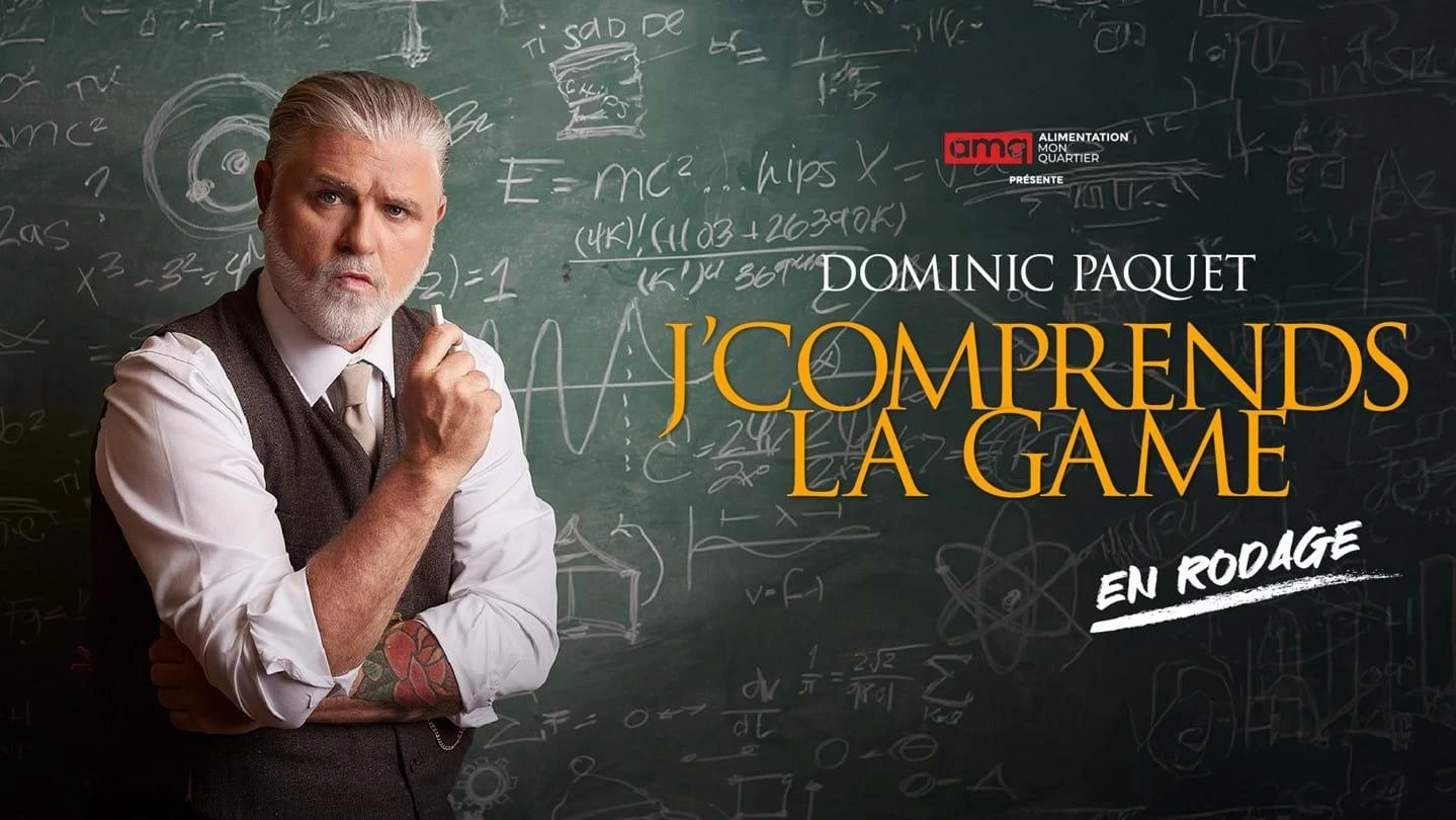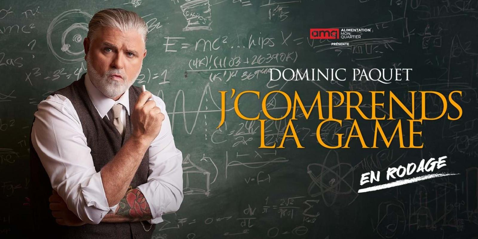 Après avoir vendu plus de 250 000 billets de son dernier spectacle, le populaire humoriste Dominic Paquet est de retour avec un tout nouveau one-man-show : J’comprends la game. Le 5e spectacle solo de Dominic se veut un gros clin d'œil à ces fameuses personnes qui, grâce à leur expérience de vie, sont certaines de comprendre des choses qui sont inaccessibles pour le commun des mortels… J’comprends la game est un laboratoire humoristique où la folie prend tout son sens alors que Dominic explore, examine et met en évidence toutes sortes de théories farfelues afin de donner des réponses à des questionnements que personne n’a jamais eus! Encore une fois, Dominic Paquet fait rire aux éclats, surprend et séduit par sa capacité à incarner des personnages uniques et à créer des expressions qui marqueront votre imaginaire!