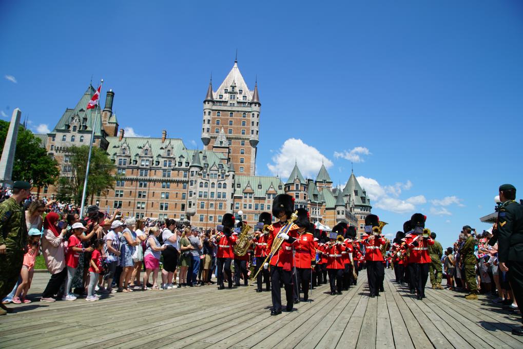 Terrasse Dufferin (11h à 14h) : Cérémonie protocolaire, lever du drapeau, défilé militaire du Royal 22e Régiment et distribution du gâteau géant du Château Frontenac.