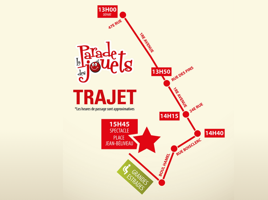 Le défilé prendra son départ au coin de la 50e rue et de la 1re Avenue à Charlesbourg à 14 h 30 pour poursuivre sur la 1re Avenue, avant d’emprunter les rues Boisclerc et l’Allée du Grand Marché et se démembrer à Place Jean-Béliveau.