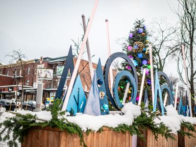Kiosques extérieurs illuminés, décorations festives et jeux de lumière se mêlent à la vue grandiose sur les montagnes et le village, créant un décor à la fois chaleureux et envoûtant.
