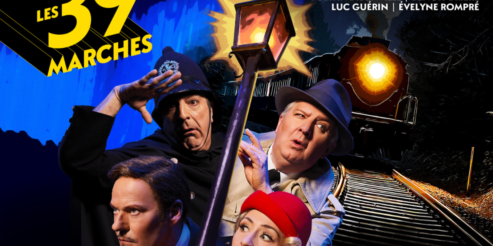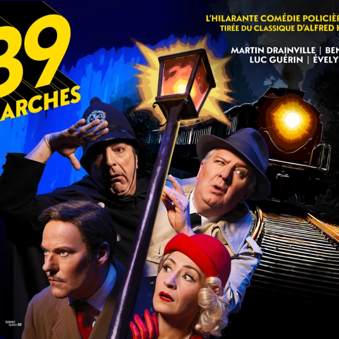 Les 39 marches, la comédie policière des plus primées à travers le monde, prend l’affiche au Québec avec en vedette Benoît Brière, Martin Drainville, Luc Guérin et Évelyne Rompré. Satire hilarante du classique film à suspense de 1935 The 39 Steps d’Alfred Hitchcock, le spectacle met en scène des dizaines de personnages, permettant au génie comique et au jeu physique des quatre acteurs de se déployer sous nos yeux. Cette délirante intrigue d’espionnage raconte l’histoire de Richard Hannay, un gentleman faussement accusé du meurtre d’une femme, forcé de partir dans une incroyable cavale à travers l’Angleterre. Pendant cette chasse à l’homme aussi captivante que désopilante, Hannay devra aussi tenter de décoder un mystérieux secret pour sauver son pays.