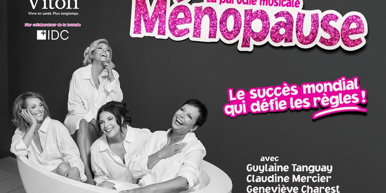 La célèbre parodie musicale Ménopause, présentée par Vitoli, arrive pour la toute première fois au Québec! À l’affiche depuis plus de 15 ans à Las Vegas, triomphant à Paris depuis 2 ans et ayant été applaudi par près de 17 millions de personnes dans 16 pays, ce spectacle festif pose un regard hilarant et sincère sur ce que les femmes vivent lorsqu’elles traversent la ménopause. Mettant en vedette les talentueuses Guylaine Tanguay, Claudine Mercier, Geneviève Charest et Catherine Sénart dans une mise en scène de Alexis Pitkevicht, Ménopause, la parodie musicale vous fera rire aux éclats, mais aussi chanter et danser sur des parodies de grands succès musicaux anglophones des années 60, 70 et 80 que vous adorez et dont l’adaptation francophone humoristique est signée par la prolifique Danièle Lorain