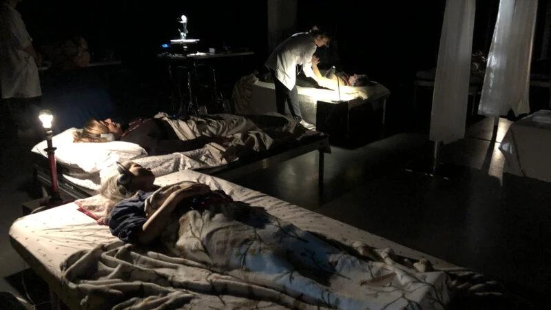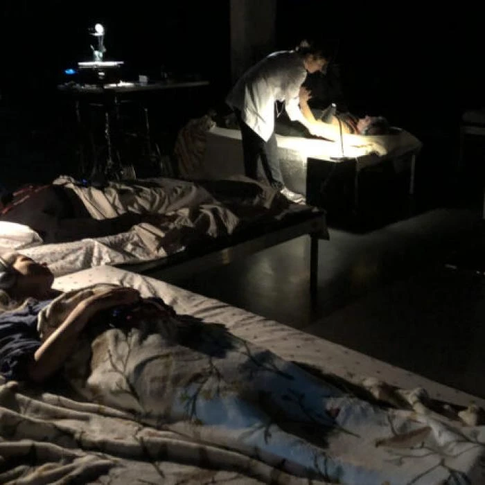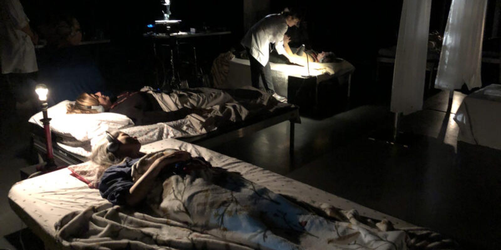 Respirer sous l’eau est un projet très personnel. Un dispositif sonore immersif est proposé afin de créer une plongée en soi, où le corps des spectateur·trices sera partie intégrante de la représentation, du décor. Certain·es sont couché·es sur des lits, d’autres sont à leur chevet ou en retrait dans l’espace. La pièce s’écoute avec des casques audio.