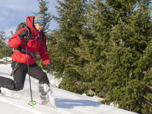 En forêt, à l’abri du vent et surtout en ascension, il n’est pas rare d’oublier le froid hivernal. Il est recommandé de prévoir un habillement multicouches pour pouvoir en retirer et en remettre au besoin. L’équipement de base consiste en des skis de randonnée avec peaux d’ascension ainsi que des bottes articulées à la cheville.