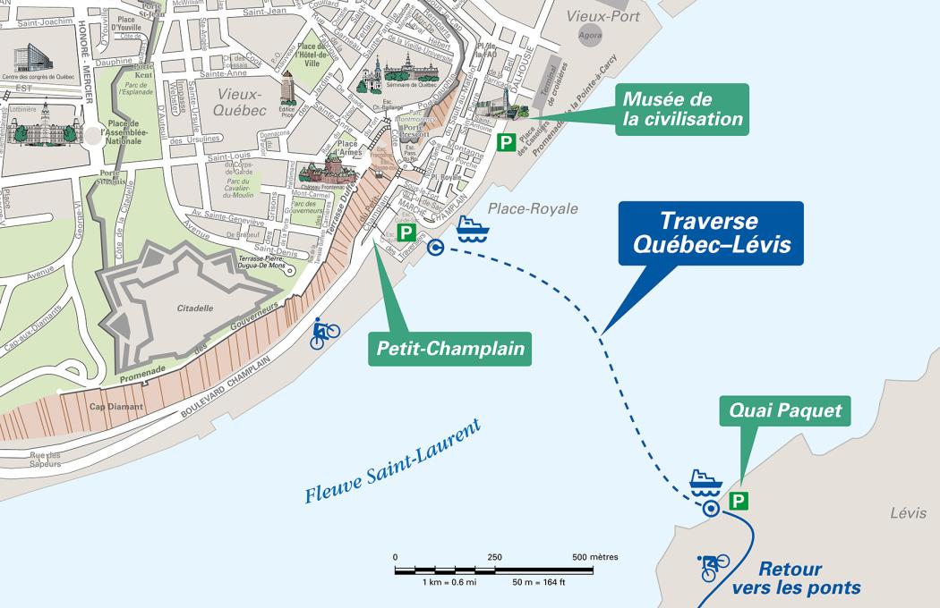 Située à proximité du Musée de la civilisation et du Petit-Champlain, la traverse Québec–Lévis est facilement accessible, peu importe votre mode de transport. Vous pourrez même laisser votre voiture dans les stationnements publics voisins si le passage à pied vous en dit. En optant pour le passage en voiture, vous pourrez faire l’aller seulement et revenir vers Québec via le pont Pierre-Laporte puis ensuite par le boulevard Champlain pour profiter de magnifiques panoramas sur le fleuve.