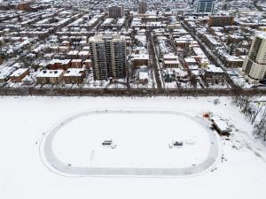 Des patineurs profitent de la patinoire extérieure à Place D'Youville, en face de Palais Montcalm.