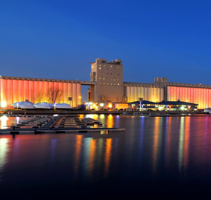 Dès que la nuit tombe, les silos de la Bunge servent de toile de fond à Aurora Boréalis, une illumination impressionnante qui anime les silos à grain aux couleurs des aurores boréales, créant une fascinante sculpture lumineuse.