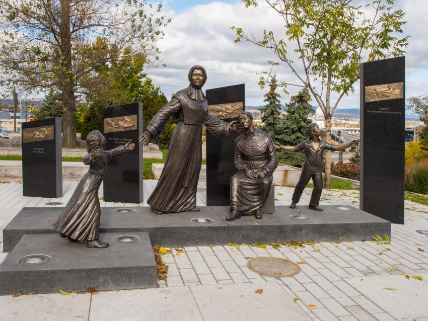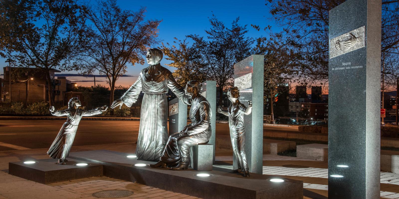 Emplacement : Entre l’avenue Honoré-Mercier et la rue des Sœurs-de-la-CharitéMère Marcelle Mallet arrive à Québec en 1849 pour fonder les Sœurs de la Charité de Québec. Elle est ici dépeinte dans une sculpture misant sur l’action, le mouvement et l’élévation, entourée d’orphelins et d’une dame âgée. Ici et là, l’artiste a répété la douce image de la main tendue, symbole de l’amour inconditionnel.