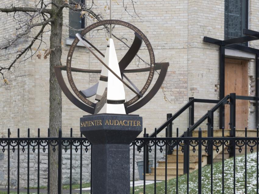 Emplacement : Collège François-de-Laval, 1, côte de la FabriqueCette œuvre célèbre les 350 ans de la fondation du Séminaire de Québec par François de Laval. Ses matériaux, le granit du pilier, le bronze de l’astrolabe et l’or du clocher, soulignent le caractère sacré de la mission des prêtres. Les formes s’élèvent vers le ciel, évoquant ainsi l’histoire qui se poursuit aujourd’hui.