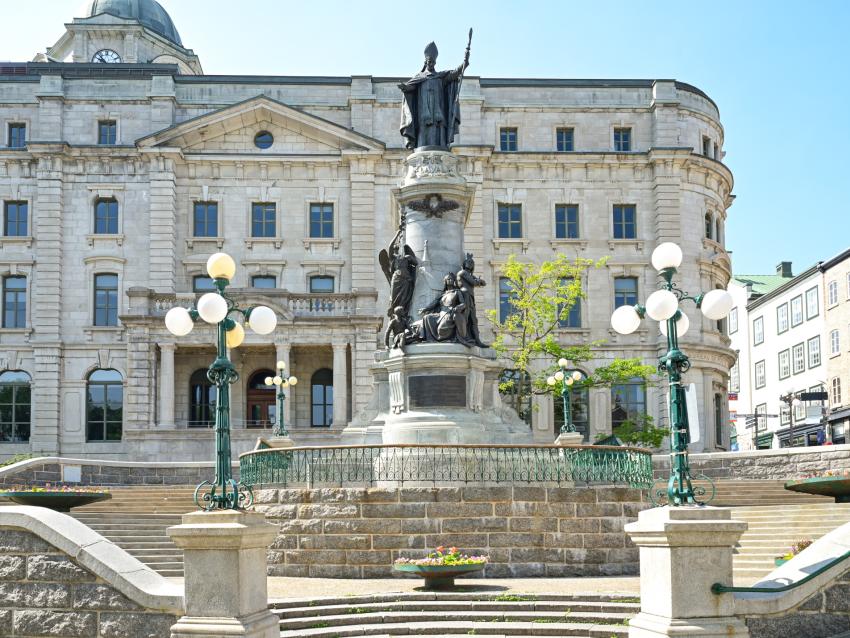 Emplacement : Édifice Louis-S.-St-Laurent, côte de la MontagneMonseigneur de Laval est le premier évêque de la Nouvelle-France et le fondateur du Séminaire de Québec. Ce majestueux monument qui surplombe le fleuve le représente debout avec sa chape, sa mitre et sa crosse, les bras ouverts dans une posture hospitalière. Au bas, des figures personnifient la religion, l’éducation, l’évangélisation et l’amour.