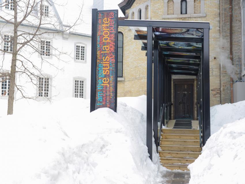 Emplacement : Basilique-cathédrale Notre-Dame-de QuébecLa Porte Sainte de la basilique-cathédrale a été inaugurée lors du 350e anniversaire de la fondation de la paroisse Notre-Dame-de-Québec. Lorsqu’elle est ouverte, on peut la franchir et vivre une expérience spirituelle transformatrice. Si elle est fermée, on peut s’y recueillir ou tout simplement admirer ses magnifiques bas-reliefs représentant le Christ et la Vierge.