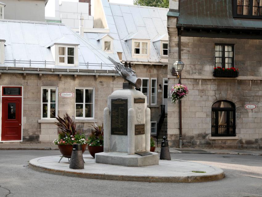 Emplacement : Place d’ArmesAu sommet de ce monument de style néogothique, une figure féminine élève dans ses bras une croix et une palme, symboles du triomphe de la Foi. Comportant à sa base une fontaine et des bas-reliefs illustrant les premières étapes de l’évangélisation au Canada, l’œuvre commémore l’arrivée des missionnaires récollets en 1615.