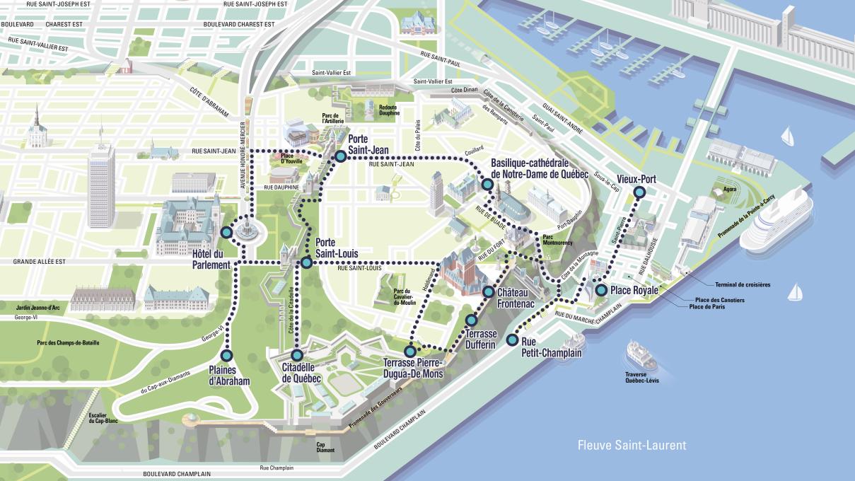 • Haute-Ville : Château Frontenac, rues à l'intérieur des fortifications, Citadelle, Parlement de Québec, plaines d’Abraham, etc.